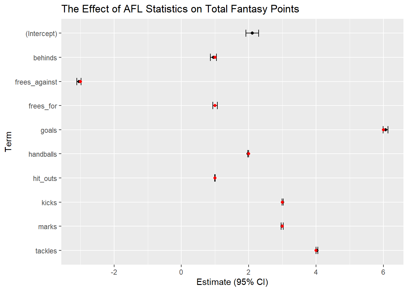 caption = "The Effect of AFL Statistics on Total Fantasy Points (95%CI)",
