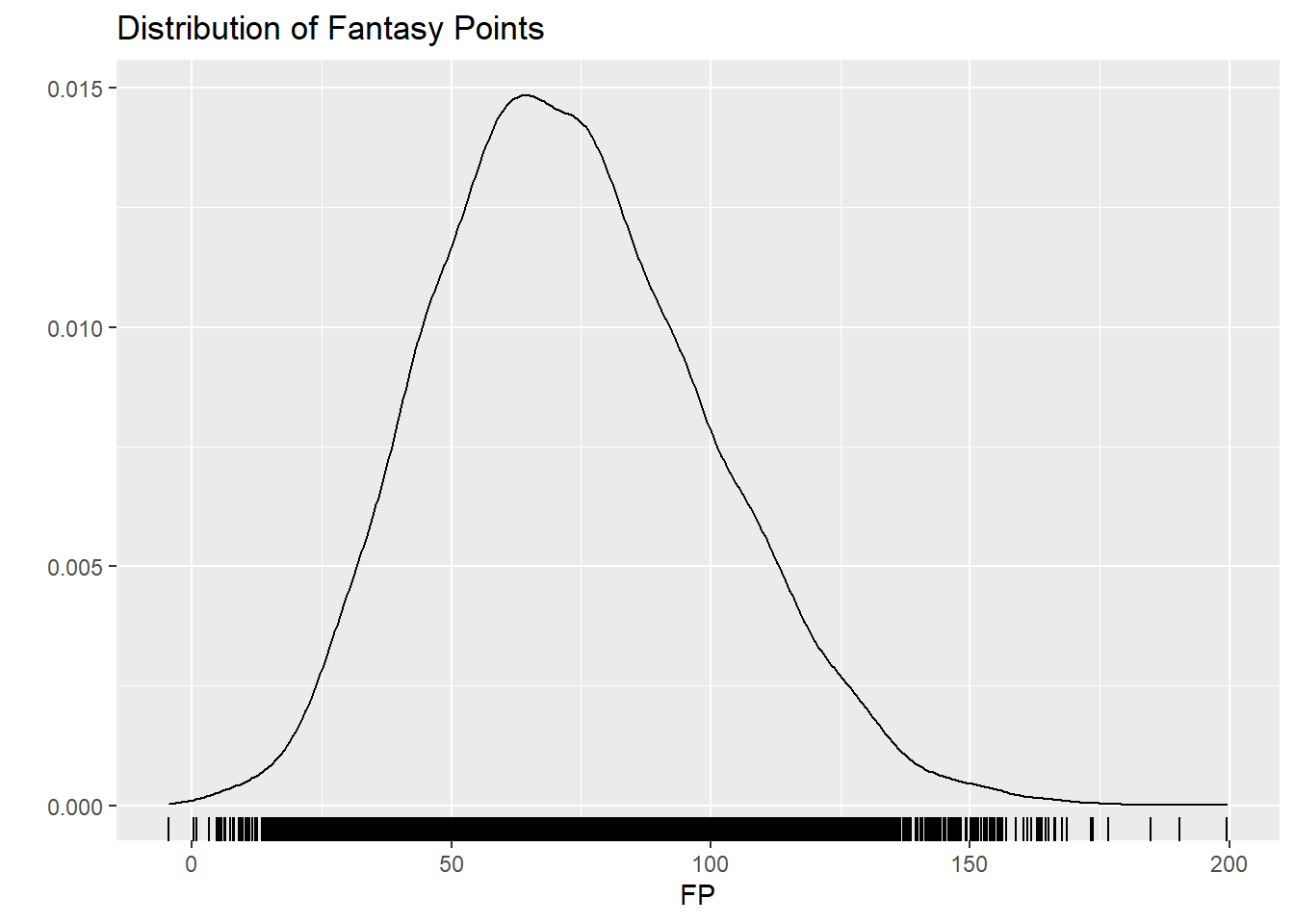 ggtitle("Distribution of Fantasy Points") + ylab("") + xlab("FP")